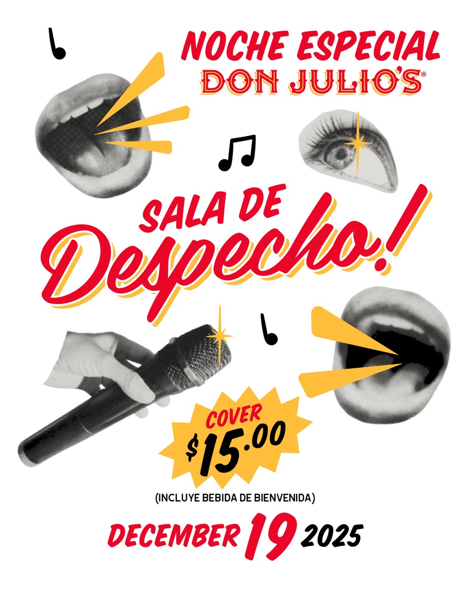 💔🎤 Sala de Despecho Night at Don Julio’s 🎶🔥Get ready for a night of music, emotions, and unforgettable vibes at Don Julio’s Taqueria. Our Sala de Despecho is a space to sing your heart out, laugh with friends, and enjoy great food and drinks in a fun, judgment-free atmosphere.